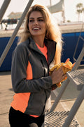 Veste polaire bicolore cintrée pour femme à zip intégral de 8 mm en plastique noir, manches raglan, coulisse réglable à la taille, élastiques serre-poignet, deux poches avec zips couverts, une poche avec zip sur le devant, col avec bordure de renfort en contraste, coutures renforcées.