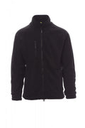 Veste polaire pour homme à zip intégral de 8 mm en plastique noir, manches raglan, coulisse réglable à la taille, élastiques serre-poignet, deux poches avec zips couverts, une poche avec zip sur le devant, col avec bordure de renfort en contraste, coutures renforcées.