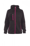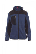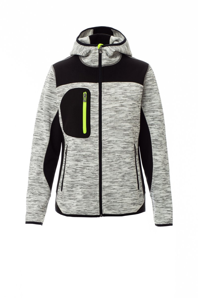 Tricot technique bicolore avec inserts en soft-shell noirs, fermeture par zip long SBS avec ruban, capuche profilée avec deux coutures. Finition avec liseré aux poignets et à la taille. Deux poches latérales avec zip, une poche poitrine.