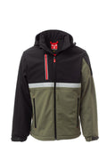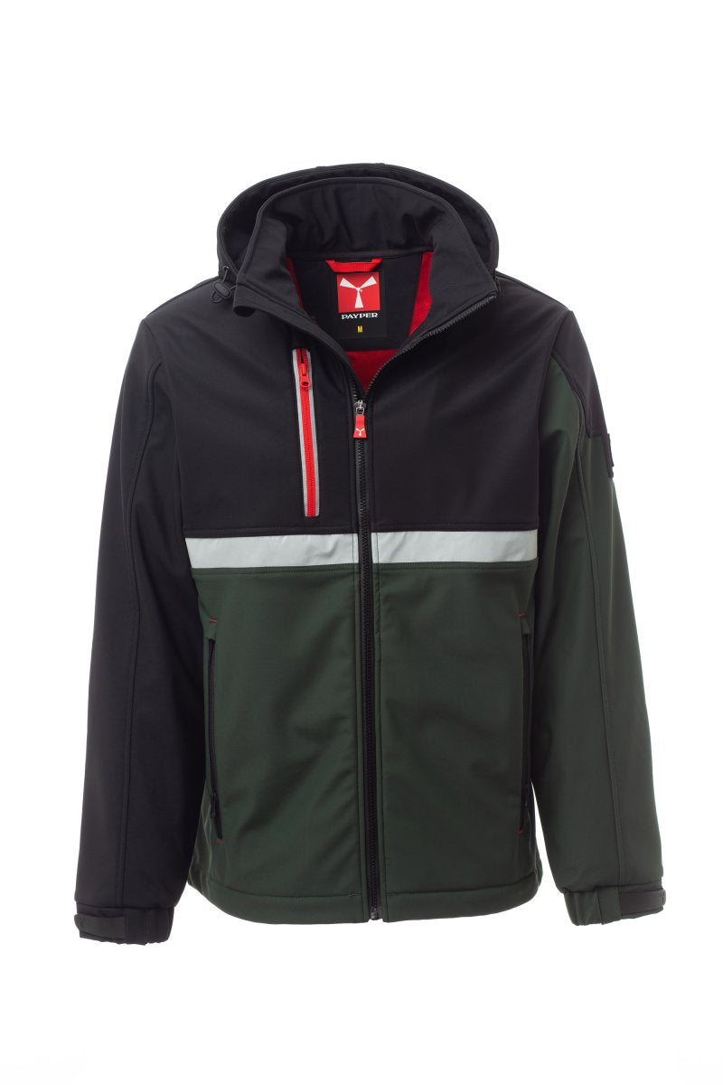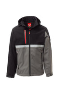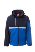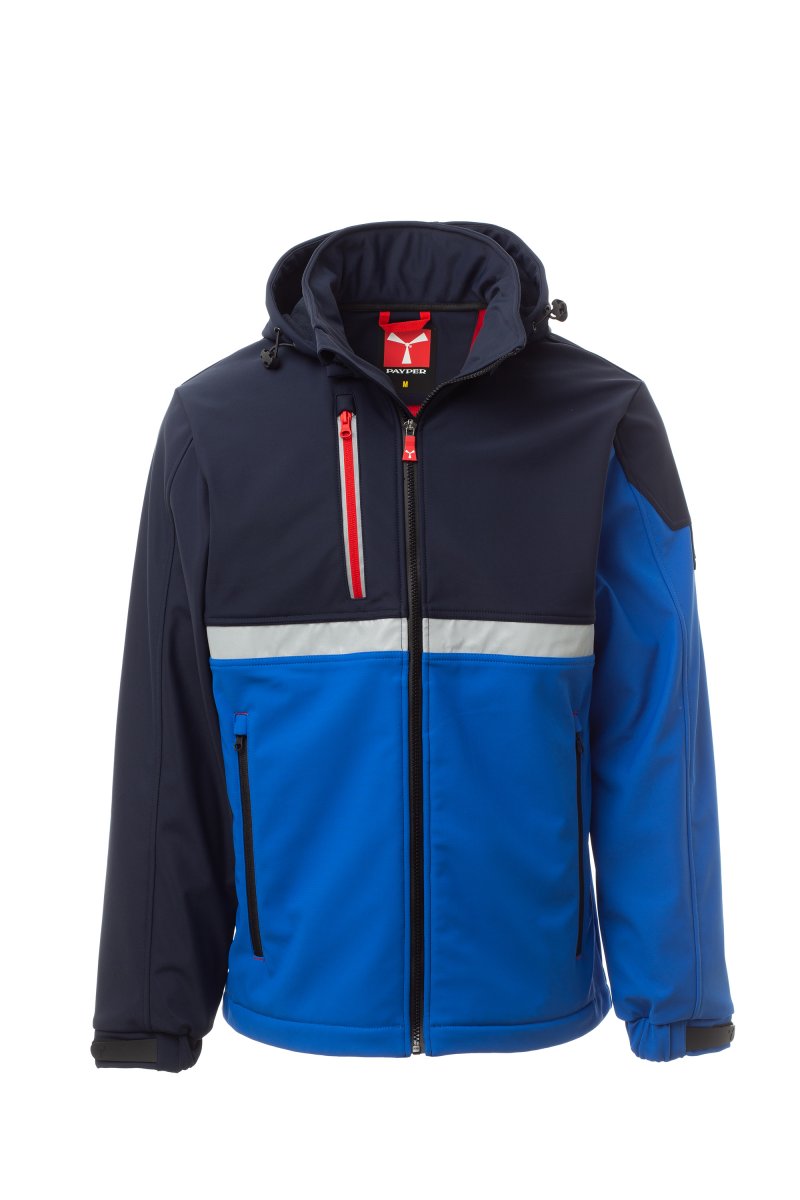 WP 8000 mm H₂O, WVT 5000 g/m² 24h. Soft-shell 3 couches, bicolore, pour homme, col avec inserts en polaire, fermeture par zip SBS avec curseur en métal à verrouillage semi-automatique et tirette personnalisée. Capuche amovible, avec coulisse réglable. Bande rétroréfléchissante frontale sur le torse. Poignets élastiqués, réglables par fermeture autoagrippante. Deux poches latérales avec zip et une poche poitrine fermée par zip avec détail rétroréfléchissant. Élément « Life-saving » au dos, avec logo interne rétroréfléchissant, fermé par zip. Une poche intérieure porte-tablette avec fermeture autoagrippante. Doublure intérieure respirante sur le dos. Bas réglable avec stoppeurs personnalisés.